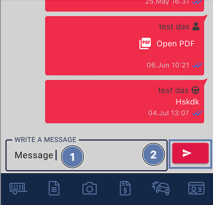 Durch Eingabe Deiner Nachricht in das Eingabefeld (1) und klicken auf die senden-Schaltfläche (2) neben dem Eingabefeld wird die Nachricht an den Dispatcher weitergeleitet.