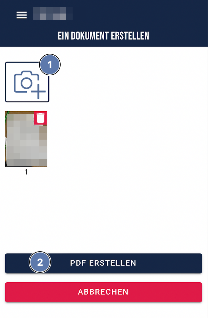 Daraufhin öffnet sich ein neues Fenster, hier klickst du das Kamerasymbol (1) an und fotografierst das benötigte Dokument ab und klickst dann auf “PDF erstellen”(2).