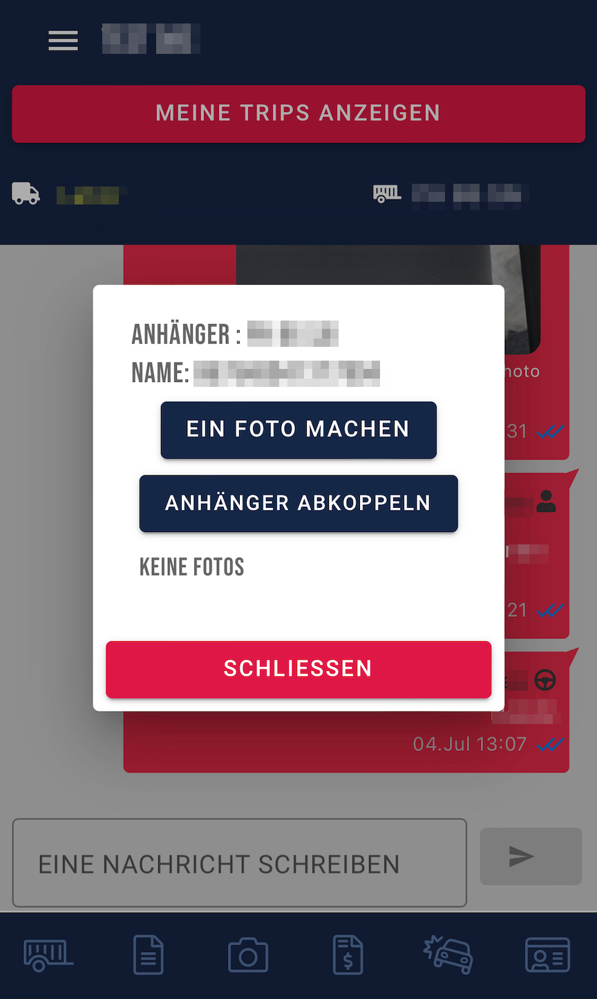 Wenn ein Hänger angehängt ist, kann man hier die Anhängerinformationen einsehen, ein Foto aufnehmen und den Anhänger abkoppeln.