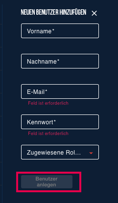 Dann öffnen sich Eingabefelder, in denen Sie den Vornamen und Nachnamen, sowie die E-Mail-Adresse des neuen Benutzers eingeben und ihm ein entsprechendes Passwort wie auch seine Rolle zuweisen (Administrator oder Unterkonto).