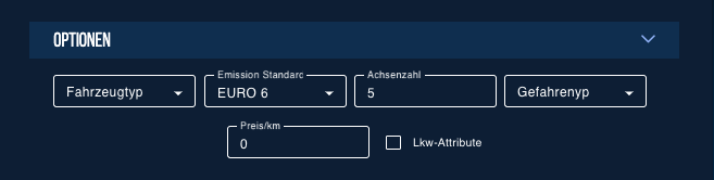Sie können zusätzliche Informationen, die für die Routenplanung und -berechnung relevant sind, unter "Optionen" bearbeiten. Dazu gehören beispielsweise der Fahrzeugtyp, der Emissionsstandard, die Anzahl der Achsen und der Gefahrentyp.