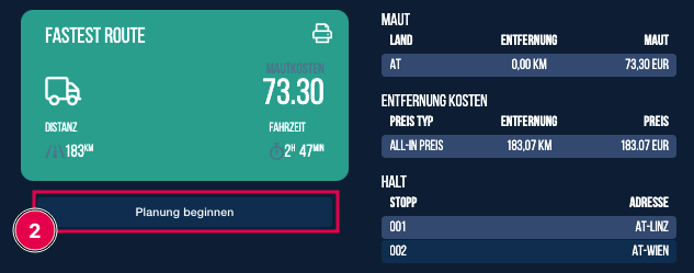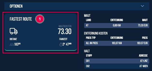 Das Ergebnis wird in einer separaten Infobox angezeigt, in der die Gesamtdistanz, die Mautkosten und die Reisezeit angezeigt werden.
