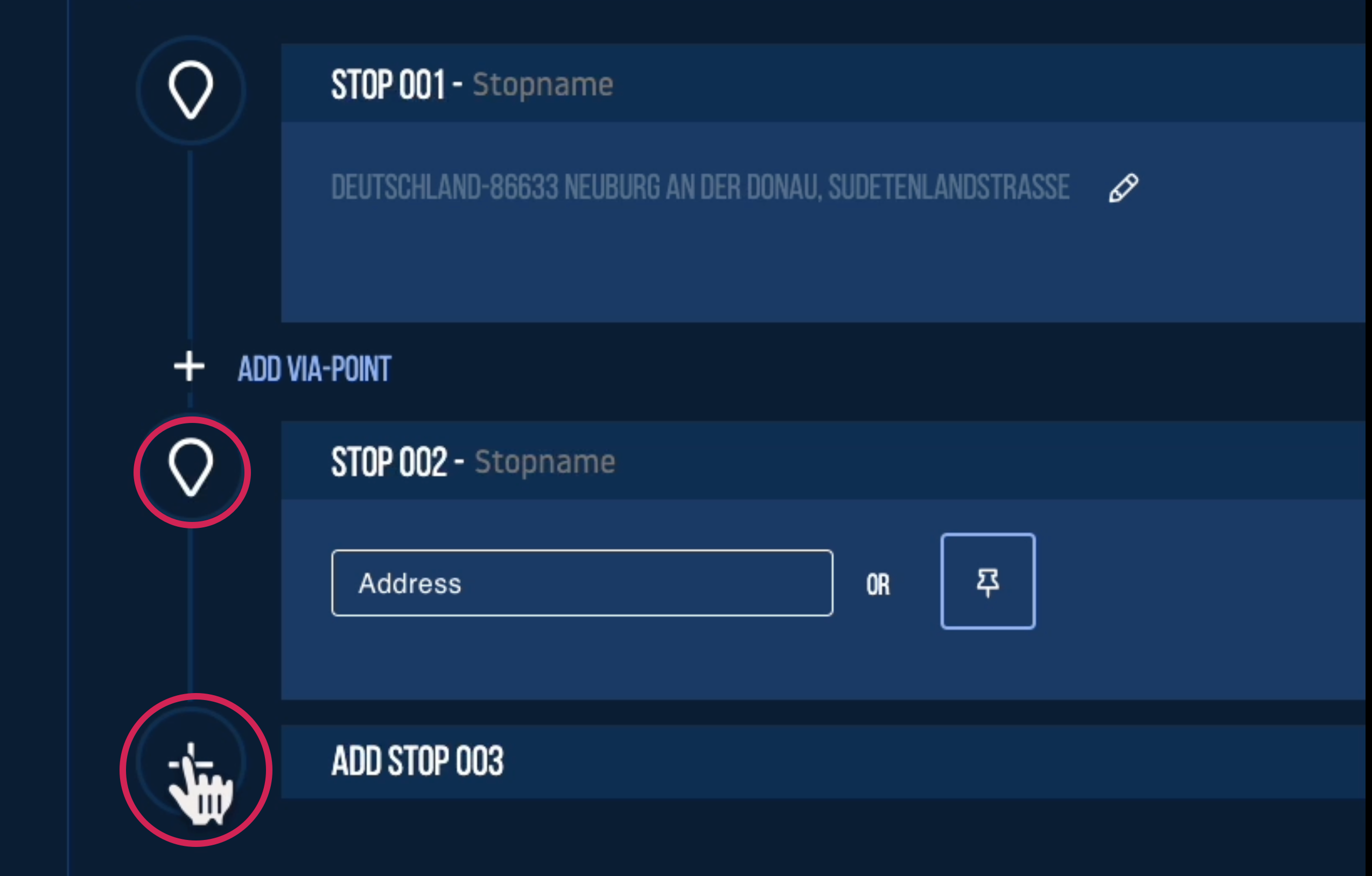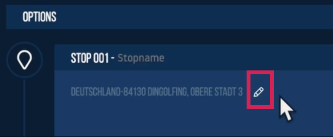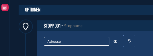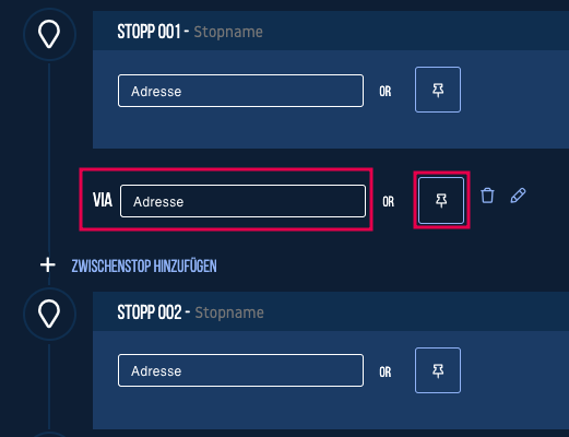 Die eingegebene oder mit dem Pin ausgewählte Adresse wird unter dem Stopp angezeigt, und hier haben Sie auch die Möglichkeit, Ihre Auswahl zu bearbeiten.