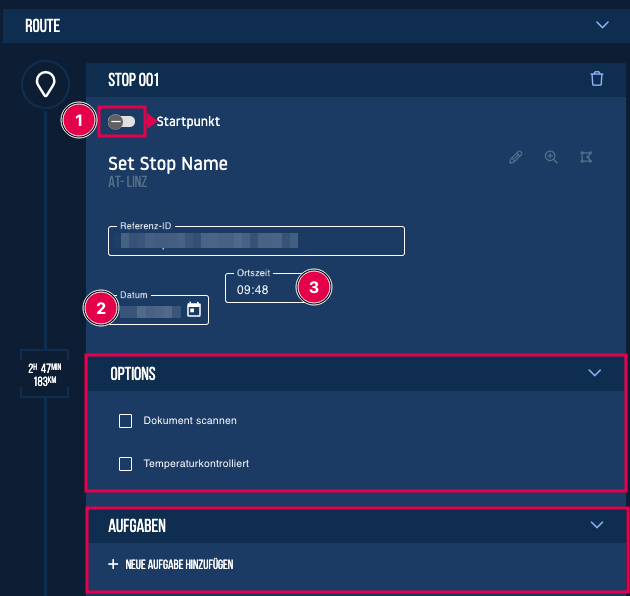 Sie können den Stopp 001 als Startpunkt festlegen (1). wichtig ist, das Datum (2) und die lokale Uhrzeit (3) auswählen.