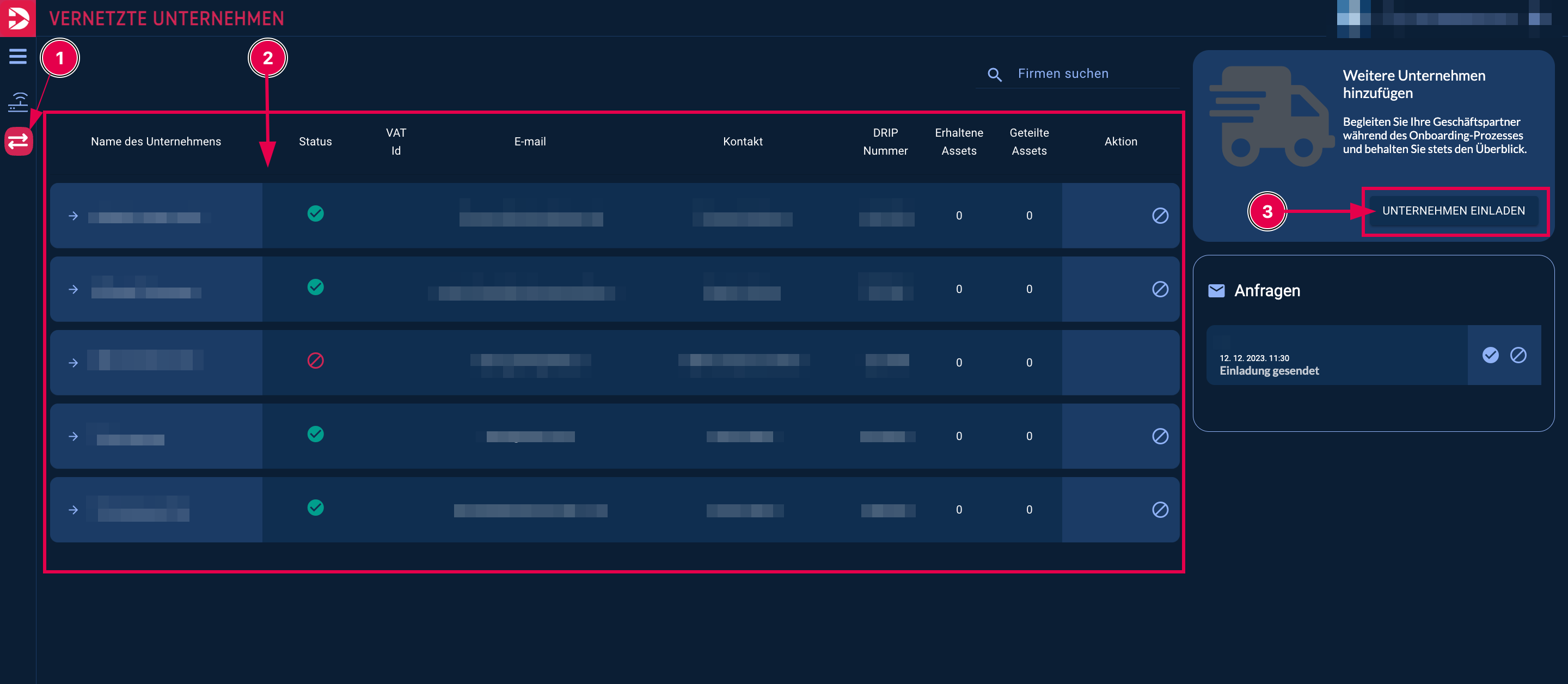 Im linken Seitenmenü klicken Sie die zweite Schaltfläche an, die die Unterseite “Vernetzte Unternehmen” öffnet (1). Dort finden Sie eine Übersicht (2), mit bereits verbundenen Unternehmen und den dazugehörigen Daten. Außerdem wird abgebildet wieviele Assets bisher mit und von den Kooperationspartnern geteilt worden sind.