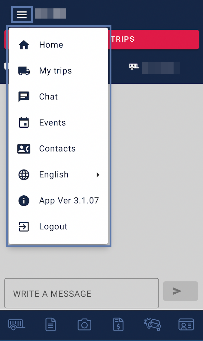 From here, you can directly swap to the home screen, to your trips, contacts or to the logout section and the chat.