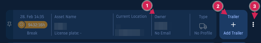 By clicking on the E-mail address (1) you will be redirected to your mail app, where you can write an E-mail to the owner of the selected asset. Here (2) you have the option to add a trailer. When clicking on the selection button (3) you find options like: “Hide Asset”, “See in Console” and “Open History”.