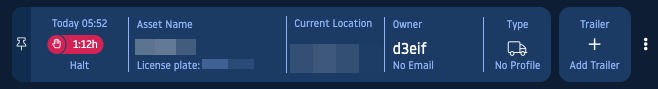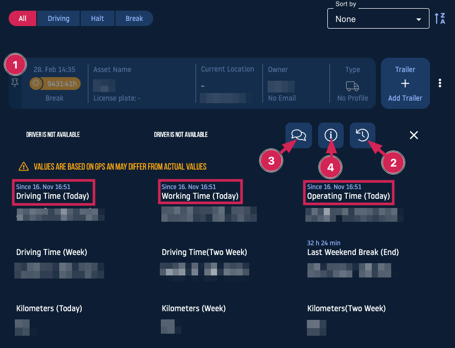 After selecting the asset (1) , an overview of driving and working hours as well as driven kilometers will open up. By clicking the refresh button (2) you can refresh the information about the asset.