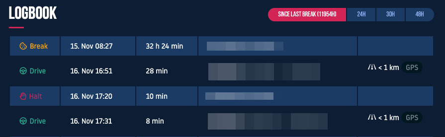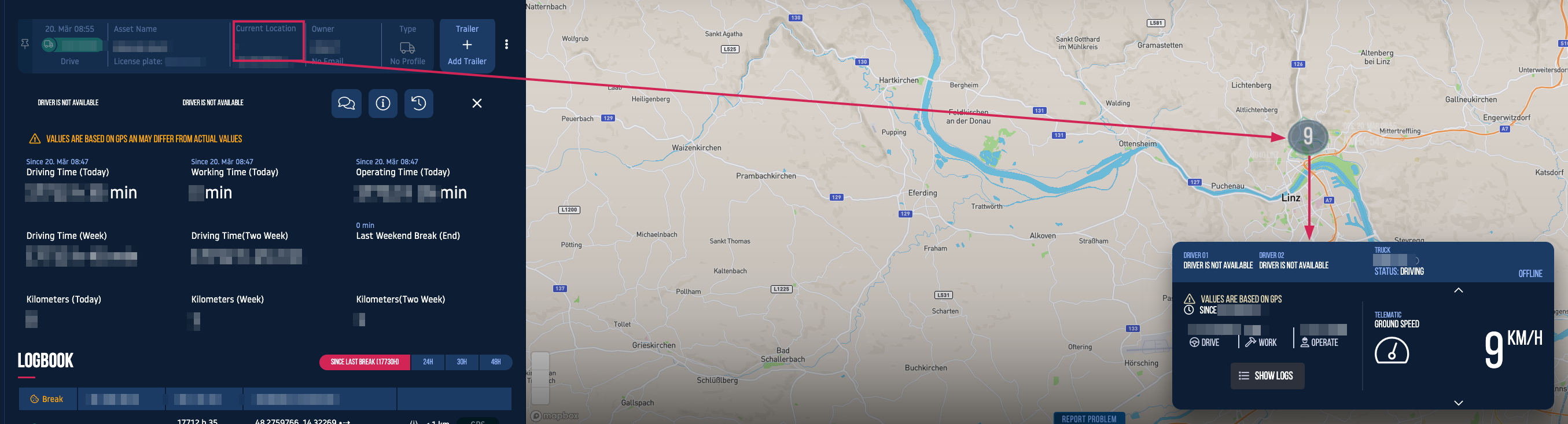 By selecting “Current Location” the last received position shows up in the map and by clicking on the shown icon you get more information like ground speed, driver etc. Additionally, you have the option to have the logs displayed.