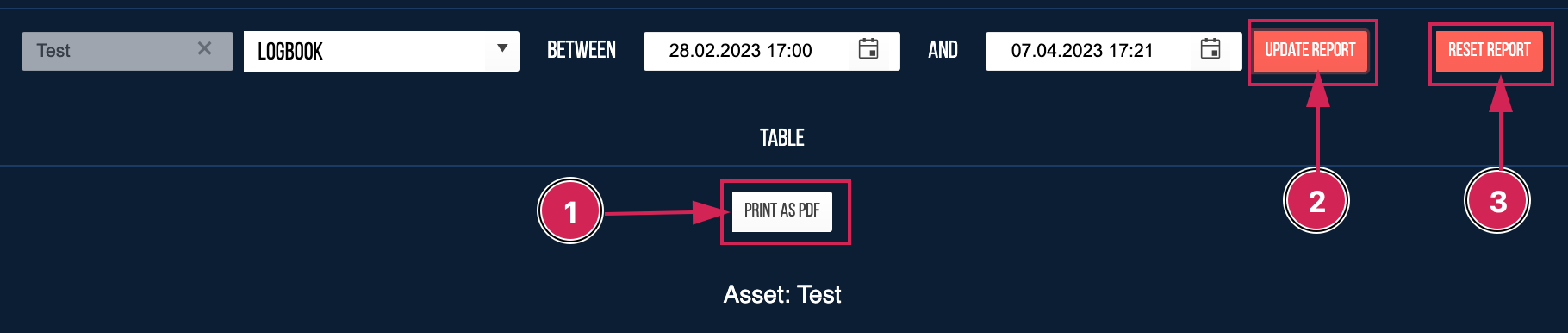 When the report has been generated, you have the option to export it as a PDF (1), reset it(3), or modify the entered data and update (2) the report.