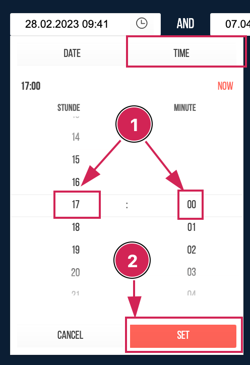 Here you can select the corresponding time( in our example 17:00) by clicking on the hours and minutes (1), and confirm your selection by clicking the 'set' button (2).